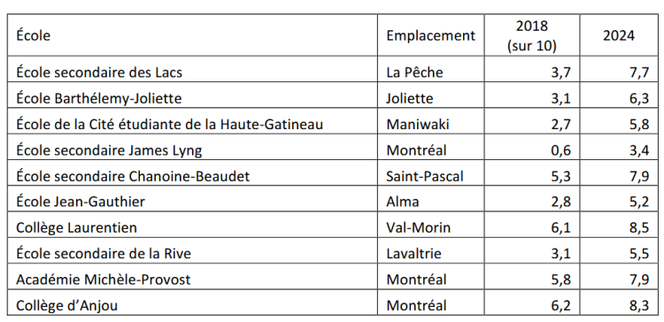 L'école qui a connu la meilleure progression, l'École secondaire des Lacs à La Pêche, a amélioré sa cote de 3,7 (sur 10) en 2018 à 7,7 en 2024.