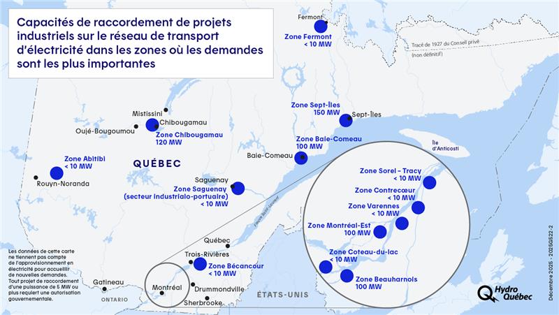 - Les capacités de raccordement de projets industriels au réseau de transport d'électricité dans les 13 secteurs où les demandes sont les plus élevées (carte ici). À noter qu'il ne s'agit pas de la disponibilité énergétique globale du Québec pour de nouveaux projets industriels, mais bien de la capacité locale du réseau de transport dans certaines zones industrielles.